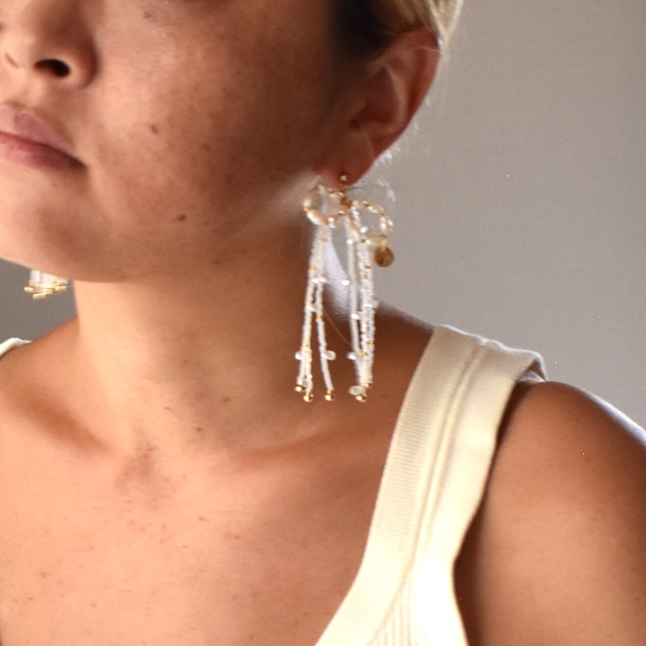 敢えて選んだ不揃いな淡水真珠が顔まわりを穏やかに彩ってくれます